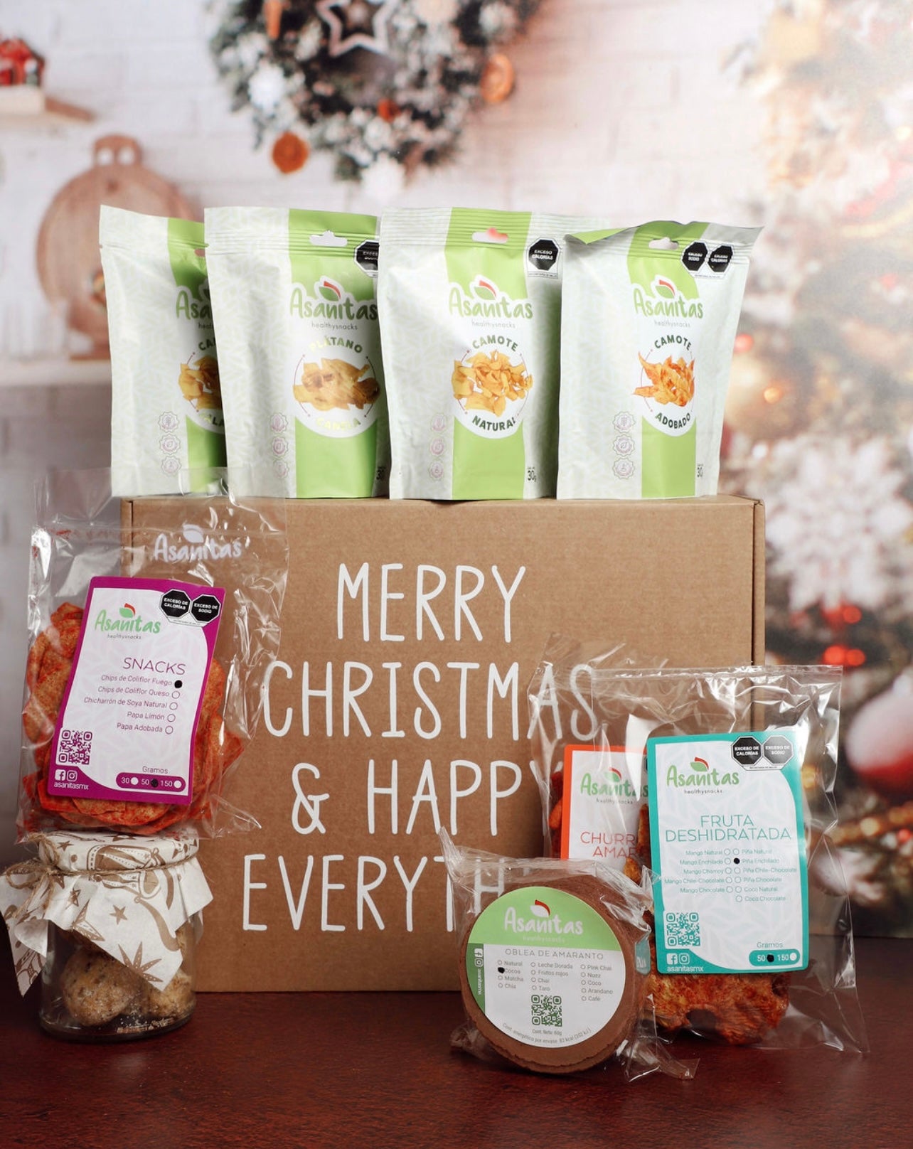 Este año nuestra caja navideña contiene sabores nuevos para tu paladar conoce nuestro nuevo sabor de camote jalapeño en su presentación pouch y las deliciosas galletas de nuez sin azúcar en en una linda presentación de cristal.